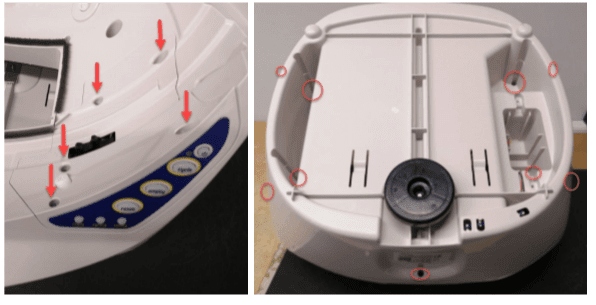 Zamontuj z powrotem i przykręć panel silnika. Odwróć podstawę kuwety, odkręć 9 śrub i otwórz podstawę.