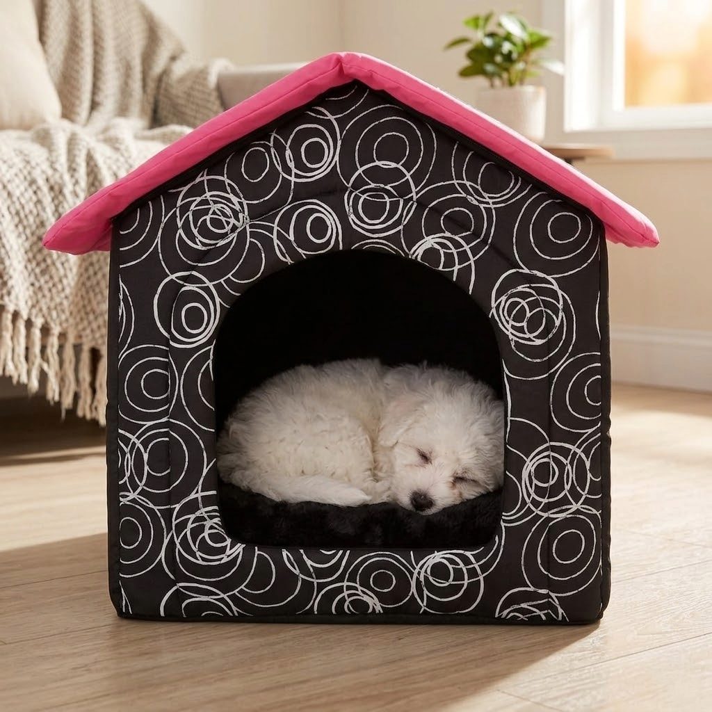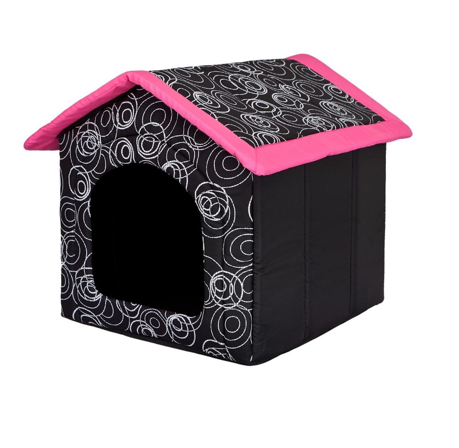 Legowisko dla psa w kształcie domku. Mocne przeszycie zapewniają niezmienny kształt podczas użytkowania. Estetyczne wykonanie. Materiał odporny na zadrapania. Możliwość wyprania dzięki zdejmowanemu pokrowcu.