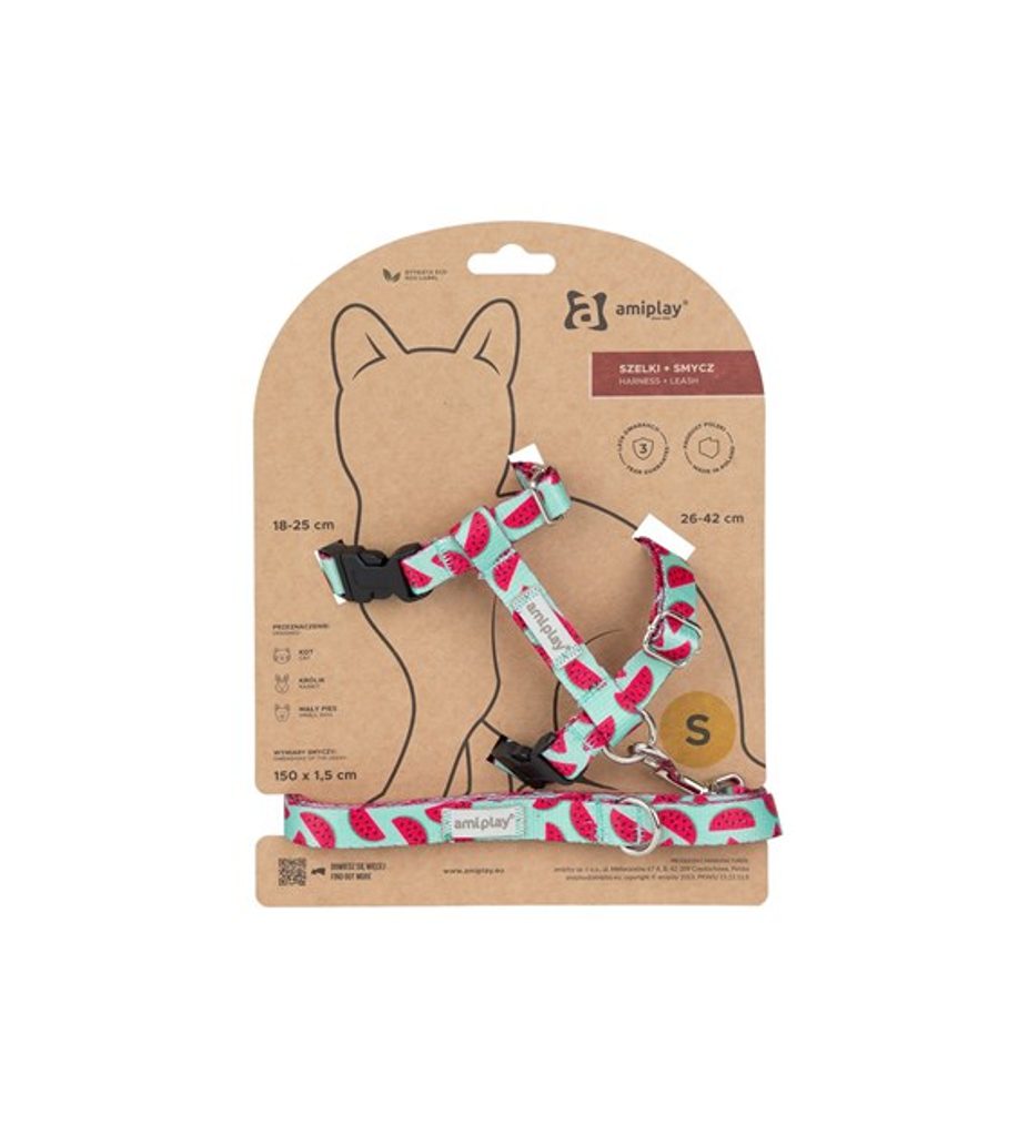 Stylowy zestaw szelki i smycze amiplay BeHappy Watermelon jest idealny do codziennych spacerów z kotem. Lekki, wygodny i wesoło kolorowy – zapewnia bezpieczne poruszanie się i maksymalny komfort Twojego pupila.