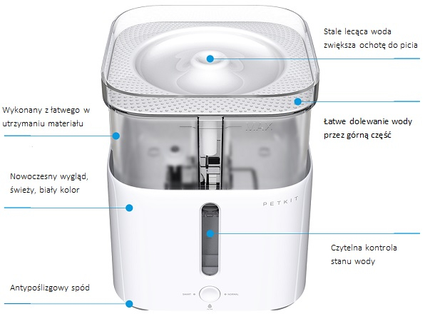 Smart dozownik został zaprojektowany w najmniejszych detalach, woda stanowi podstawę życia każej istoty na ziemi, nie wyłączając naszych psów czy kotów. Wyjątkowa konstrukcja zapewnia stała cyrkulację wody, filtrowanie jest gwarancją czystości i świeżości. Jak w wodospadzie - technolodzy inspirowali się przyrodą. Woda przechodząc przez filtry zyskuje smak, który doceni każdy zwierzak, zobaczysz, że Twój zwierzak znacznie zwiększy jej spożycie. Urządzenie i sposób w jaki podawana jest woda na pewno zaciekawi Twojego ulubieńca, efektem tego będzie większa ochota do picia. Regularne spożywanie odpowiedniej ilości wody jest podstawą dla zdrowia.