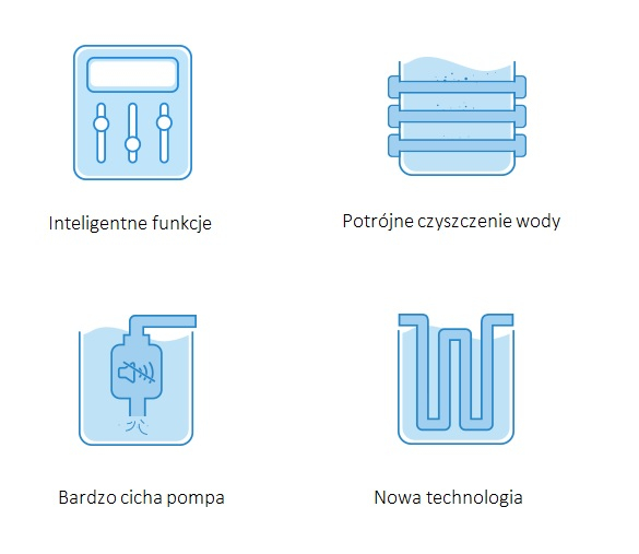 - Wskaźnik stanu wody - inteligentny dozownik zawsze podpowie Ci kiedy uzupełnić wodę, pomoże w tym świecąca kontrolka.
