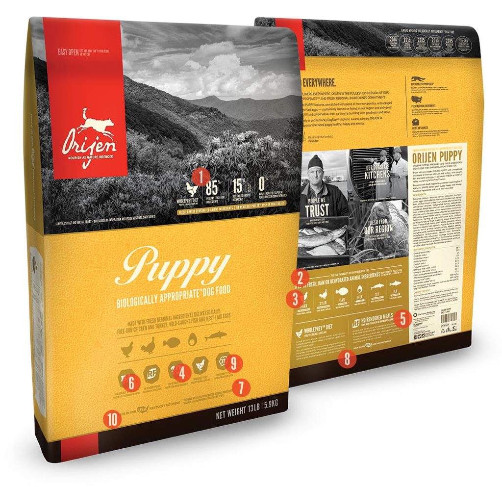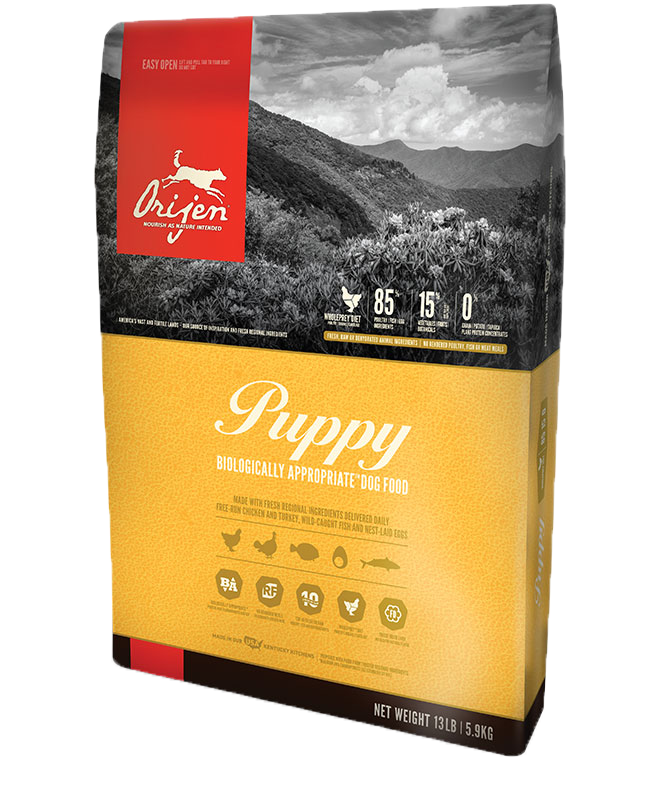 Wysokobiałkowa, sucha karma ORIJEN PUPPY z niską zawartością węglowodanów i bez zbóż dla szczeniąt wszystkich ras. Odzwierciedla bogatą, różnorodną i zbilansowaną dietę z mięs, owoców, warzyw i traw, którą szczenięta i młode psy spożywałyby żyjąc dziko